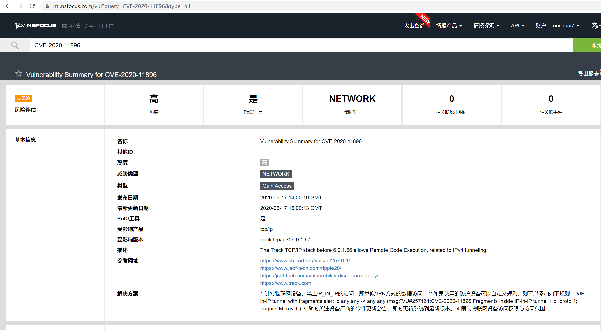 ¿ËÈÕ£¬ÒÔÉ«ÁÐÍøÂçÇå¾²¹«Ë¾JSOFµÄÑо¿Ö°Ô±ÔÚTreck¹«Ë¾¿ª·¢µÄµ×²ã TCP/IP Èí¼þ¿âÖз¢Ã÷ÁË19¸ö0dayÎó²î£¬°üÀ¨CVE-2020-11896¡¢CVE-2020-11897¡¢CVE-2020-11898¡¢CVE-2020-11899¡¢CVE-2020-11900¡¢CVE-2020-11901¡¢CVE-2020-11902¡¢CVE-2020-11903¡¢CVE-2020-11904¡¢CVE-2020-11905¡¢CVE-2020-11906¡¢CVE-2020-11907¡¢CVE-2020-11908¡¢CVE-2020-11909¡¢CVE-2020-11910¡¢CVE-2020-11911¡¢CVE-2020-11912¡¢CVE-2020-11913¡¢CVE-2020-11914¡£ÕâЩÎó²î±»JSOFÃüÃûΪ“Ripple20”¡£