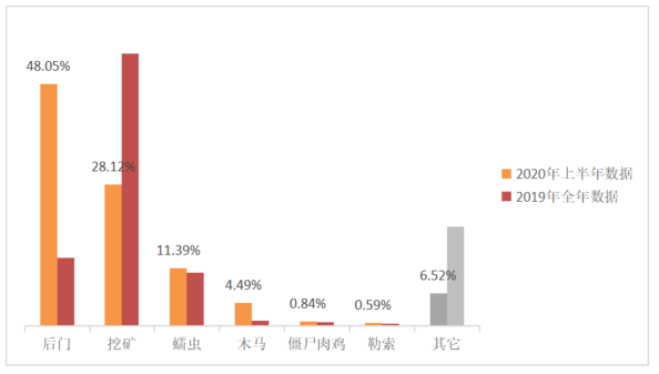 2020ÄêÉϰëÄêÊý¾ÝÓë2019Äê¶ÈÊý¾ÝÖжñÒâÈí¼þÖÖÖÖÐÍÂþÑÜÈçÏÂͼËùʾ¡£ÉϰëÄê¸÷¶ñÒâÈí¼þÀàÐÍÕ¼±ÈÏà±ÈÈ¥ÄêÕûÄêÇéÐÎÓÐËù²¨¶¯ £¬ºóÃÅÈ¡´úÍÚ¿ó¾ÓÓÚÊ×λ £¬Õ¼±È48.05%£»ÍÚ¿óÏà½ÏÓÚÈ¥ÄêÕûÄêµÄÊý¾Ý±ÈÀýÓдó·ùϽµ £¬È䳿»îԾˮƽÓëÈ¥ÄêÕûÄê³Öƽ £¬ºÍºóÃÅÒ»ÆðÕ¼ÓÐÕûÌå¶ñÒâÈí¼þÔ˶¯µÄ87%¡£